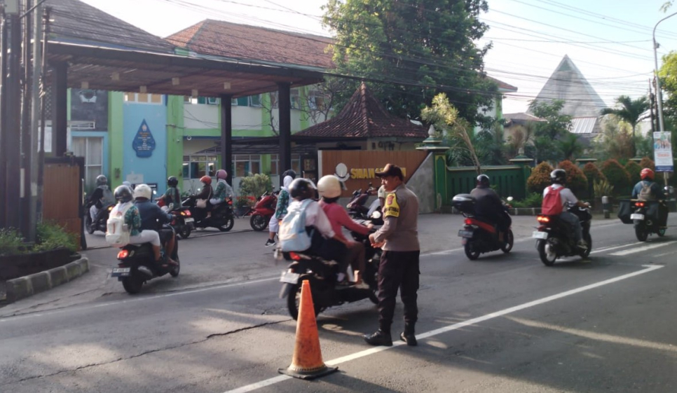 Bhabinkamtibmas Kalurahan Bangunharjo Laksanakan Pos Pagi di Depan SMA Negeri 1 Sewon