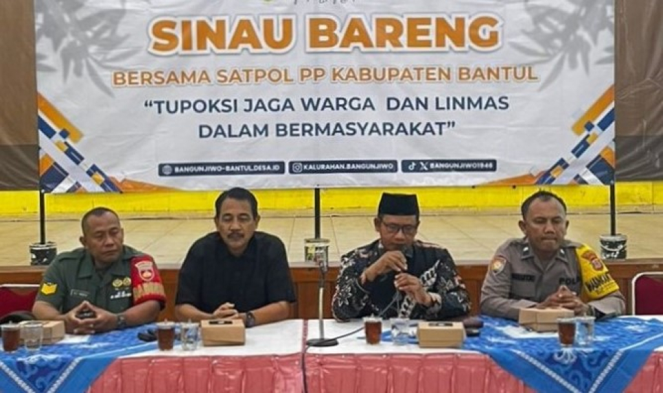 Bhabinkamtibmas Kalurahan Bangunjiwo, Aipda Siswantoro, menghadiri kegiatan "Sinau Bareng" bersama Satuan Polisi Pamong Praja (Satpol PP) Kabupaten Bantul dengan tema Tupoksi Jaga Warga dan Linmas Kabupaten Bantul, di Balai Kalurahan Bangunjiwo, Kasihan, Bantul, Rabu (26/11/2025).Kegiatan ini bertujuan untuk meningkatkan pemahaman tentang tugas pokok dan fungsi (tupoksi) Jaga Warga dan Linmas, sehingga mampu meningkatkan sinergi dan koordinasi dalam menjaga keamanan dan ketertiban di lingkungan masyarakat.
