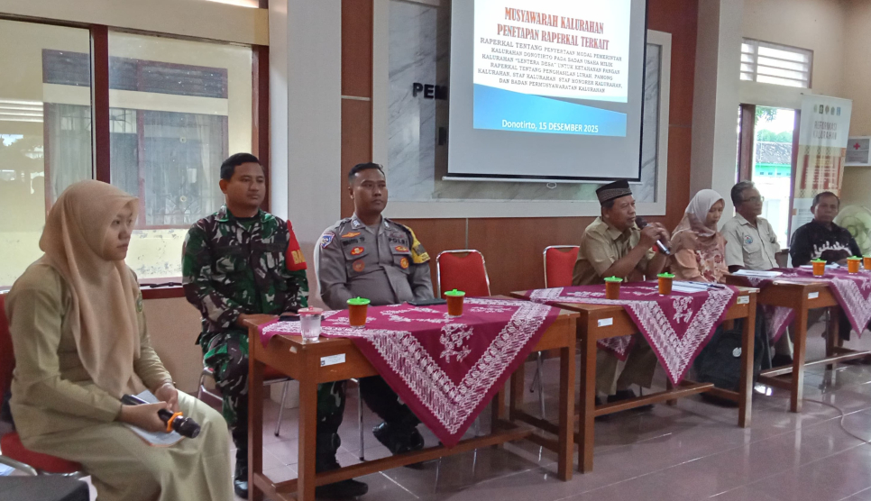 Bhabinkamtibmas Kalurahan Donotirto, Brigadir Wahyu, menghadiri kegiatan Musyawarah Kalurahan yang digelar di Aula Kalurahan Donotirto, Kretek, Bantul, Senin (15/12/2025).Musyawarah ini dipimpin oleh Lurah Donotirto, H. Jurahimi, dan dihadiri oleh Pendamping Kalurahan, Bamuskal, Pamong, perwakilan kader, Babinsa, serta unsur terkait lainnya.