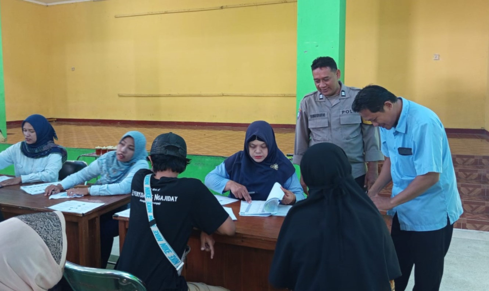 Bhabinkamtibmas Kalurahan Imogiri, Aipda Norwan Ikhvantoro melakukan monitoring penyaluran Bantuan Cadangan Pangan (BCP) di Gedung Krajan Kalurahan Imogiri, Bantul, Selasa (25/11/2025).Bantuan tersebut berupa 20 kilogram beras dan 4 liter minyak goreng disalurkan kepada 393 warga.