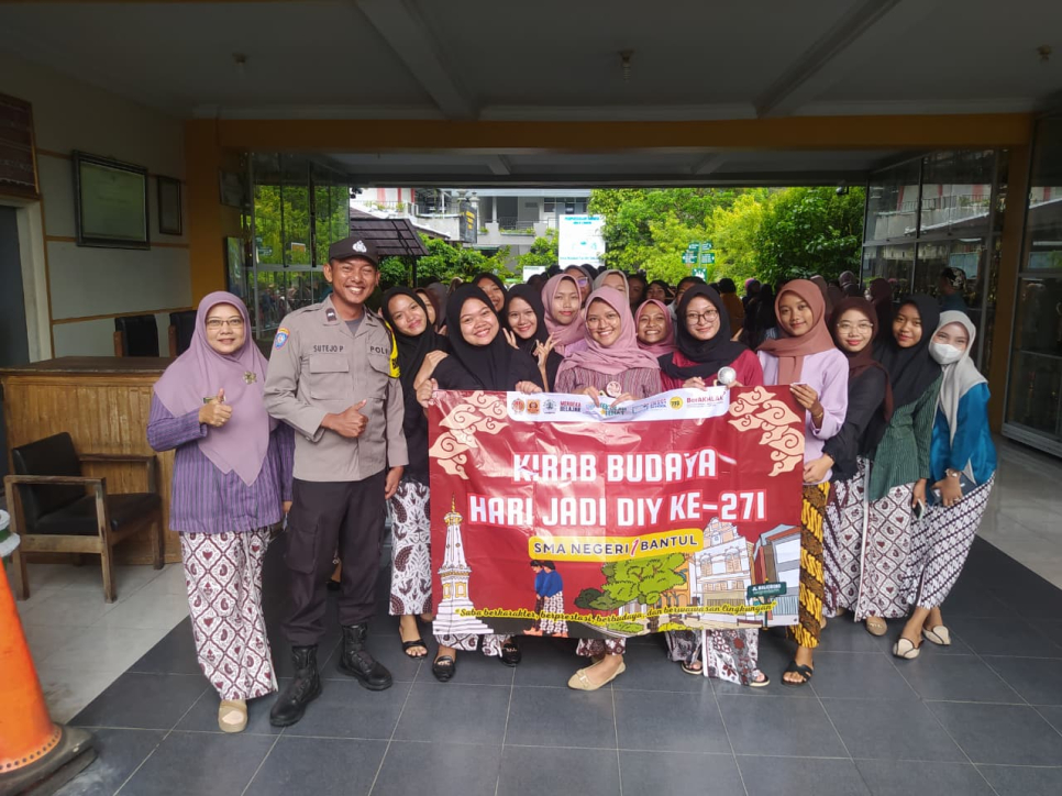 Dalam rangka memperingati Hari Jadi Daerah Istimewa Yogyakarta (DIY) ke-271, Bhabinkamtibmas Kalurahan Palbapang Polsek Bantul, Aipda Sutejo Pramono, S.H., melaksanakan pengamanan kegiatan Kirab Budaya yang diselenggarakan oleh SMA Negeri 1 Bantul, Jumat (13/02/2026) pagi.Kegiatan kirab budaya tersebut dilaksanakan mulai pukul 07.00 WIB hingga selesai, bertempat di lingkungan SMA N 1 Bantul, Jetis Sumuran RT 03, Kalurahan Palbapang, Kapanewon Bantul, Kabupaten Bantul.