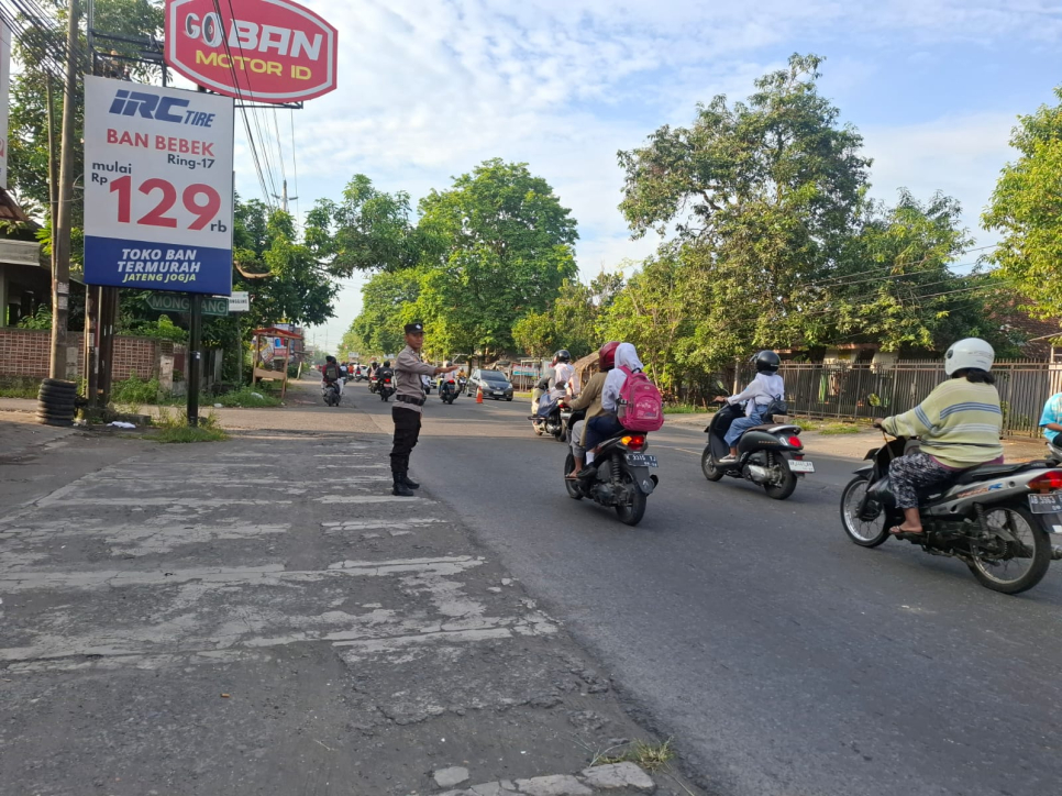 Bhabinkamtibmas Kalurahan PendowoharjoLaksanakan Kegiatan Pengaturan Arus Lalu Lintas Pagi di Depan SDN Monggang