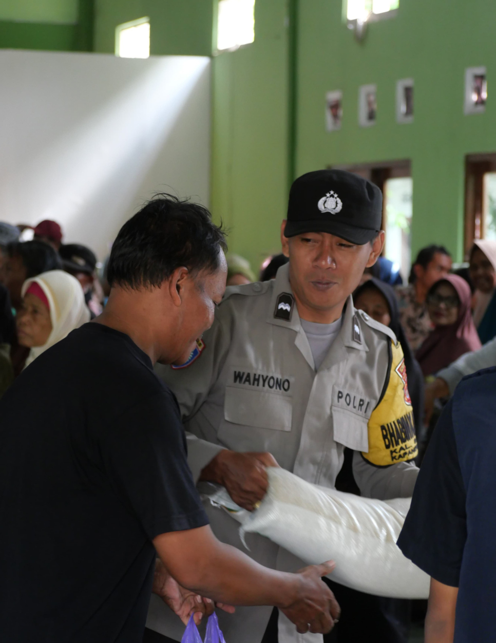 Bhabinkamtibmas Kalurahan Sriharjo, Aipda Wahyono SH, melakukan pemantauan penyaluran Bantuan Sosial (Bansos) berupa beras 20 kilogram dan 4 liter minyak goreng kepada 951 warga, di Kalurahan Sriharjo, Imogiri, Bantul, Selasa (25/11/2025).Kehadiran Bhabinkamtibmas Aipda Wahyono untuk memastikan proses penyaluran berjalan tertib, aman, dan lancar.