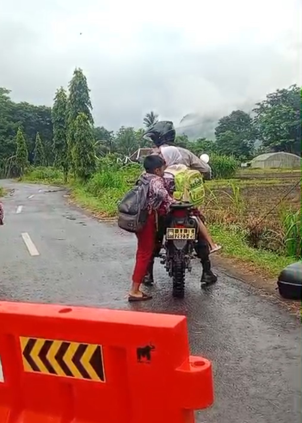 Bhabinkamtibmas Kalurahan Sriharjo, Aipda Wahyono, menunjukkan kepedulian tinggi terhadap masyarakat dengan melaksanakan kegiatan kemanusiaan, Rabu (26/11/2025) pagi,Aipda Wahyono menjemput dan mengantarkan anak-anak sekolah yang terpaksa berjalan kaki jauh akibat akses jalan terputus karena bencana tanah longsor beberapa hari lalu.