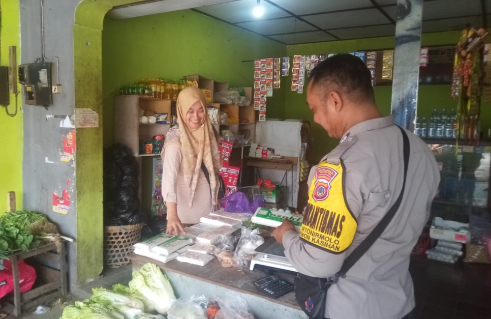 Bhabinkamtibmas Kalurahan Tirtonirmolo, Aiptu Agus Haryanto, melaksanakan kegiatan sambang di Pasar Desa Nirmolo, Tirtonirmolo, Kasihan, Bantul, Senin (5/1/2026).Kegiatan sambang tersebut menyasar toko sayuran dan sembako yang berada di kios Pasar Nirmolo.