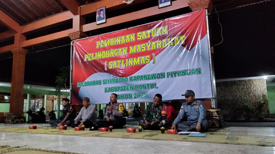 Bhabinkamtibmas Kalurahan Sitimulyo, Aipda Nuryanto, melaksanakan kegiatan pembinaan dan penguatan peran kepada anggota Satuan Perlindungan Masyarakat (Satlinmas) Sitimulyo.Kegiatan pembinaan tersebut digelar di Joglo Kalurahan Sitimulyo pada Rabu malam (03/12/2025), dimulai tepat pukul 20.00 WIB hingga selesai.