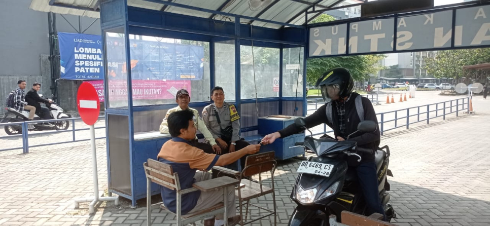 Bhabinkamtibmas Tamanan Sambangi Satpam dan Petugas Parkir Kampus UAD, Sampaikan Pesan Kamtibmas