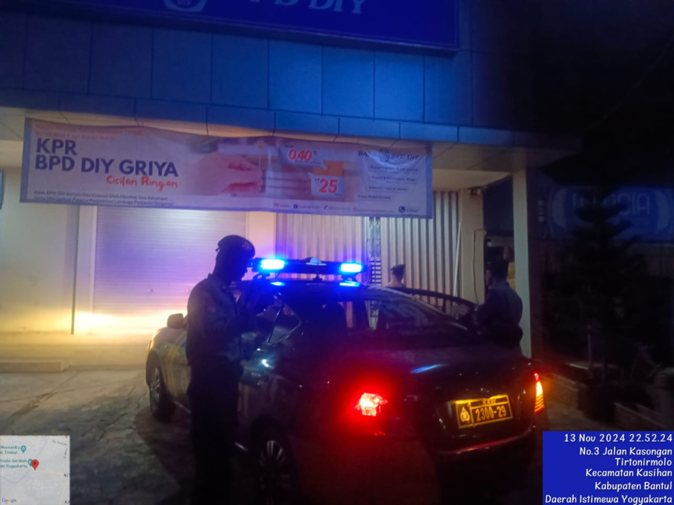 Berbagai upaya terus dilakukan untuk menciptakan situasi kamtibmas agar tetap aman dan kondusif di wilayah hukum Polsek Kasihan, salah satunya dengan mengintensifkan patroli secara rutin.Seperti yang dilaksanakan Polsek Kasihan, dipimpin oleh Panit Samapta Ipda Sigit Budi dengan menyambangi kantor Bank BPD Kasongan, Kasihan, Bantul, Rabu (14/11/2024) malam.