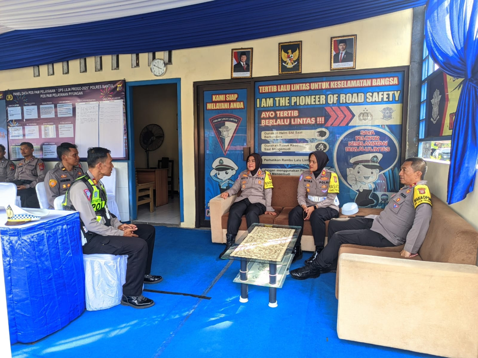 Kapolres Bantul, AKBP Novita Eka Sari, S.H., S.I.K., M.H., melakukan kunjungan langsung ke Pos Pengamanan (Pos Pam) Piyungan pada Kamis sore (25/12/2025). Kunjungan ini bertujuan untuk memastikan kesiapan personel dan sarana prasarana dalam pelaksanaan Operasi Lilin Progo 2025 guna mengamankan perayaan Natal dan Tahun Baru.Dalam kunjungan tersebut, Kapolres didampingi oleh Wakapolres Bantul Kompol Citra Fatwa R. S.Sos., S.I.K., M.M., M.I.K., Kasat Reskrim AKP Achmad Mirza, serta Kasat Lantas AKP Ritma Jayanti. Kehadiran pejabat utama Polres Bantul ini disambut langsung oleh Kapospam beserta seluruh anggota yang bertugas di titik strategis jalur perbatasan tersebut.