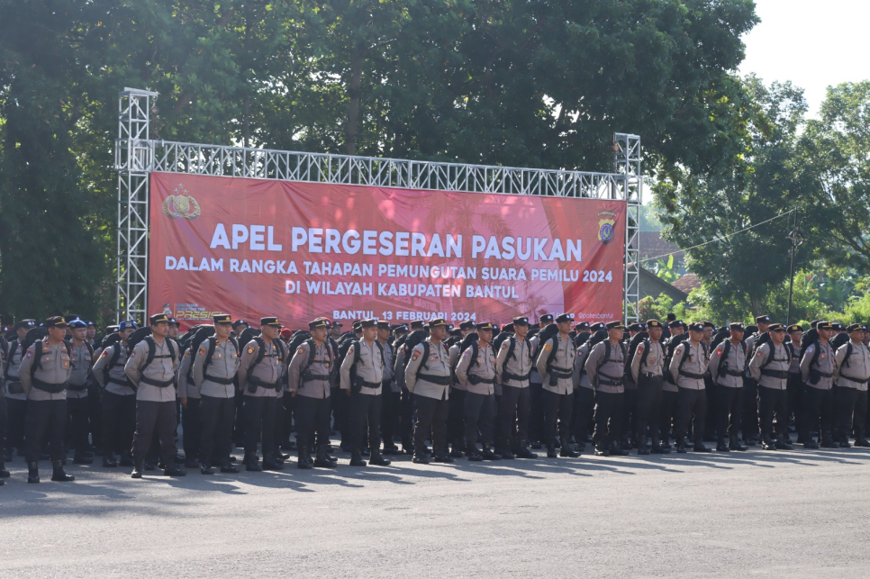Apel pergeseran pasukan tersebut digelar di parkir timur Stadion Sultan Agung, Bantul, Selasa (13/2/2024). Apel pergeseran pasukan dipimpin langsung Kapolres Bantul, AKBP Michael R Risakotta.
