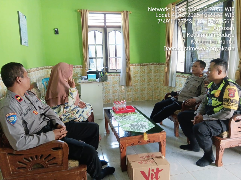 Kapolsek Sedayu, Kompol Slamet Subiyantoro, S.H., bersama Panit Binmas, Banit Intel, serta Bhabinkamtibmas Argosari melaksanakan kegiatan sambang dan silaturahmi kamtibmas kepada salah satu tokoh masyarakat, Ibu Ardhiyani Muslimah, yang merupakan Dukuh Tonalan, Argosari, Sedayu, pada Kamis 4/12/2025.Sambang ini dilakukan dalam rangka mempererat hubungan antara pihak kepolisian dan tokoh masyarakat setempat, sekaligus menjaga situasi keamanan dan ketertiban masyarakat menjelang perayaan Natal dan Tahun Baru.