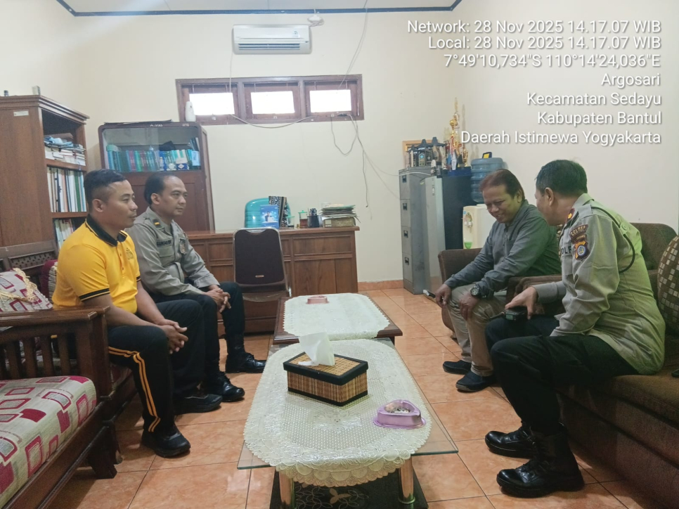 Kapolsek Sedayu Kompol Slamet Subiyantoro SH, didampingi Bhabinkamtibmas Argosari Aiptu Agus Muslim, melaksanakan kegiatan sambang kamtibmas di Kalurahan Argosari pada Jumat (28/11/2025).Kedatangan Kapolsek disambut langsung oleh Lurah Argosari, Sudarno.