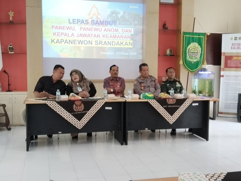 Kapolsek Srandakan, AKP Jumadi, S.H., menghadiri kegiatan pisah sambut Panewu Srandakan dan Kepala Jawatan Keamanan yang dilaksanakan di Aula Kapanewon Srandakan pada Jumat pagi (13/02/2026).Kegiatan tersebut merupakan agenda resmi serah terima jabatan Panewu Srandakan dari Bapak Sarjiman, S.IP., M.E. kepada Panewu Anom Ibu Karjiyem, serta serah terima Kepala Jawatan Keamanan. Acara berlangsung khidmat dan dihadiri oleh unsur Forkopimkap, jajaran perangkat kapanewon, lurah se-Kapanewon Srandakan, tokoh masyarakat, serta tamu undangan lainnya.