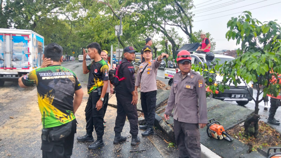 Polsek Banguntapan bersama Personel Brimob Polda DIY, BPBD Bantul melakukan evakuasi pohon tumbang yang menutupi badan jalan di Ringroad Selatan Banguntapan, tepatnya di tikungan selatan Perwacy, Mutihan, Kalurahan Wirokerten, Kapanewon Banguntapan, Kabupaten Bantul, Kamis (29/1/2026) sekitar pukul 14.15 WIBKegiatan evakuasi tersebut dipimpin langsung oleh Kapolsek Banguntapan AKP Wahyu Aji Wibowo, S.T.K., S.I.K. Pohon tumbang akibat kondisi daun yang rimbun dan lebat, ditambah hujan yang disertai angin cukup kencang, sehingga menyebabkan pohon tidak mampu menopang beban dan akhirnya roboh ke arah jalan.