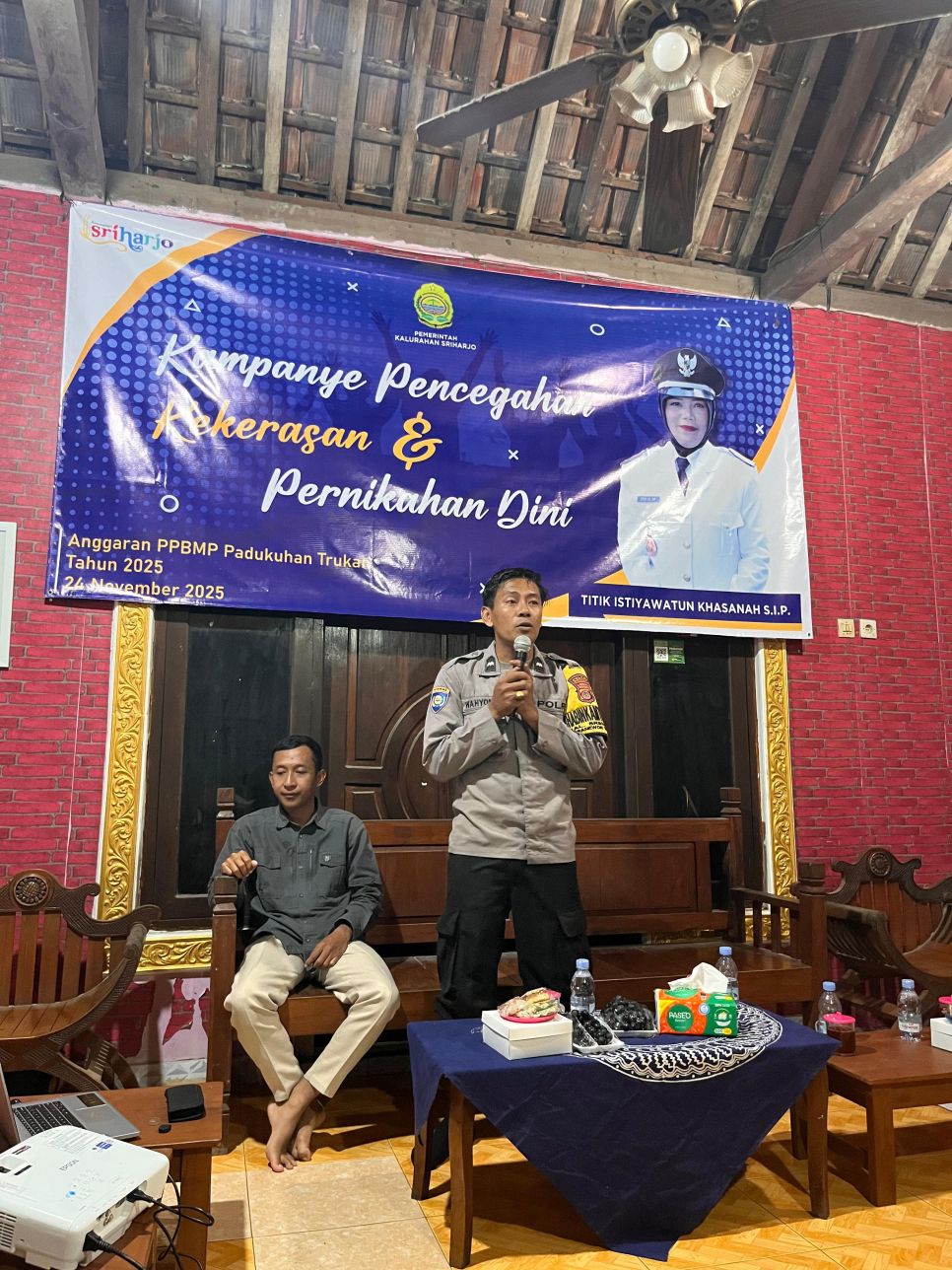 Bhabinkamtibmas Kalurahan Sriharjo, Aipda Wahyono, S.H., bersama Puskesmas Imogiri 2, menggelar sosialisasi anti narkoba dan bahaya pernikahan dini di Pedukuhan Trukan, Senin (24/11/2025) malam. Kegiatan ini dihadiri Lurah Sriharjo, tokoh masyarakat, dan puluhan muda mudi.Aipda Wahyono mengingatkan generasi muda untuk menjauhi narkoba. "Narkoba hanya akan merusak masa depan. Jaga diri, jaga keluarga," katanya. Sementara itu, tim Puskesmas Imogiri 2 menekankan dampak buruk pernikahan dini terhadap kesehatan reproduksi dan pendidikan.