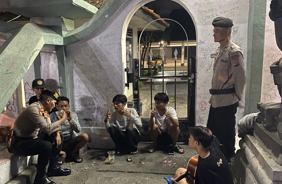Saat melaksanakan patroli, petugas mendapati sekelompok remaja yang sedang asyik nongkrong. Dengan pendekatan humanis, Polisi memberikan imbauan kamtibmas dan meminta para remaja tersebut untuk segera membubarkan diri serta kembali ke rumah masing-masing.