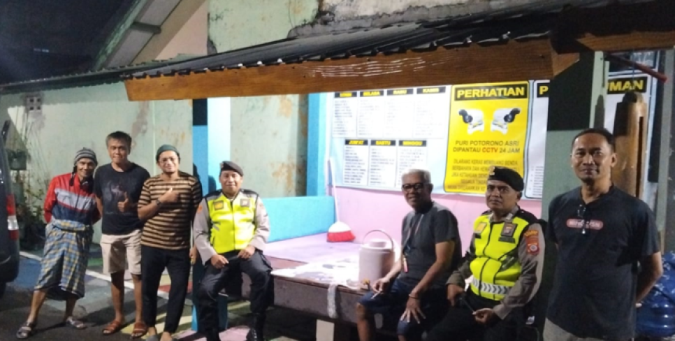 Petugas kepolisian berdialog langsung dengan warga yang sedang melaksanakan ronda malam. Petugas juga menyampaikan pesan-pesan kamtibmas agar tetap waspada terhadap situasi lingkungan sekitar.