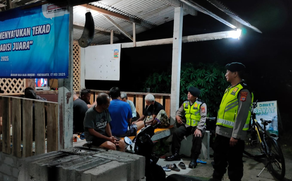 Anggota Unit Samapta Polsek Piyungan melaksanakan patroli malam hari dengan menyambangi pos kamling di Dusun Karangploso, Sitimulyo, Piyungan, Bantul, Minggu (14/12/2025).Dalam kegiatan tersebut, petugas berdialog dengan warga yang sedang melaksanakan ronda malam. Petugas menyampaikan pesan-pesan kamtibmas agar warga senantiasa meningkatkan kewaspadaan terhadap potensi tindak kejahatan, terutama pada malam hari, serta mengaktifkan kegiatan ronda secara rutin.