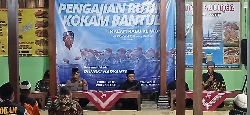 Kapolsek Kretek, AKP Joko Mulyono, menghadiri pengajian rutin malam Rabu Kliwon yang diadakan oleh Komando Kesiapsiagaan Angkatan Muda Muhammadiyah (Kokam) Kabupaten Bantul pada Selasa (27/1/2026). Acara ini berlangsung di kawasan Pantai Tall Wollu, Parangtritis, Kretek, Bantul.Pengajian ini dihadiri oleh berbagai elemen masyarakat, perwakilan Koramil Kretek, Pimpinan Cabang Muhammadiyah (PCM) Kretek, jamaah pengajian, serta aparat kewilayahan seperti Babinsa dan Bhabinkamtibmas Kelurahan Parangtritis.