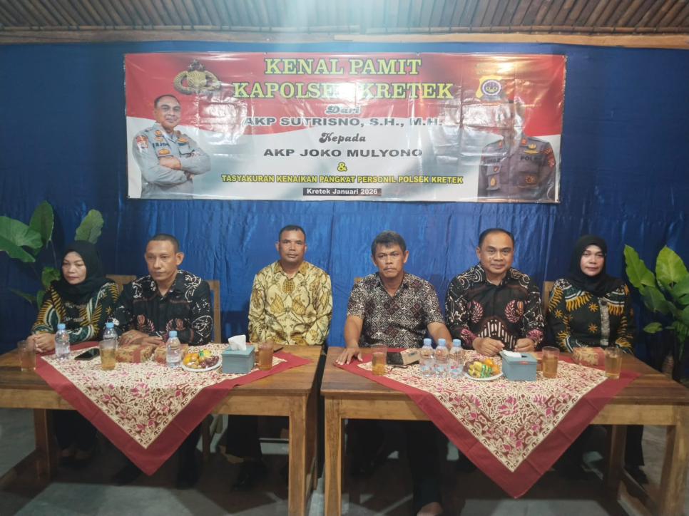 Jajaran Polsek Kretek menyelenggarakan acara kenal pamit Kapolsek pada Selasa (6/1/2026). Kegiatan ini berlangsung khidmat dengan nuansa kekeluargaan yang kental sebagai bentuk penghormatan bagi pimpinan lama dan penyambutan bagi pimpinan baru.