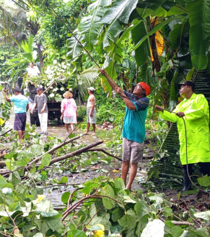 Tanpa menunggu waktu lama, Aiptu Toto Choirudin bersama Ketua RT setempat dan warga sekitar bahu-membahu membersihkan material pohon. Dengan menggunakan peralatan seadanya dan gergaji mesin, petugas dan warga memotong batang serta ranting pohon yang melintang di tengah jalan.