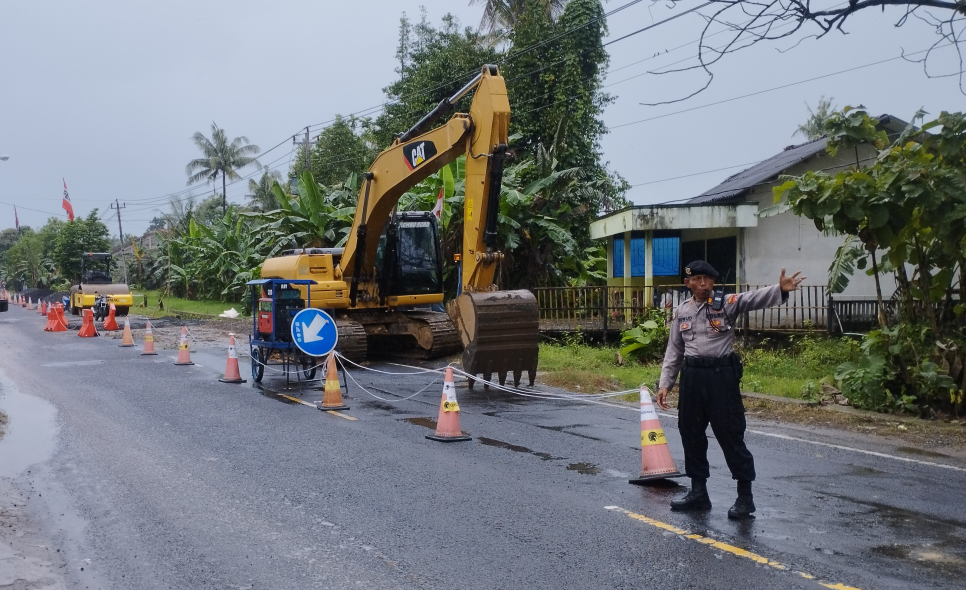 Personel Polsek Kretek melaksanakan pengamanan dan pengaturan arus lalu lintas di Jalan Parangtritis, Kretek, Bantul, Rabu (26/11/2025). Kegiatan ini dilakukan terkait dengan adanya proyek pembangunan gorong-gorong di sepanjang jalur utama tersebut.Pembangunan gorong-gorong ini merupakan langkah antisipasi untuk mencegah aliran air sungai yang sering membawa lumpur meluap ke jalan raya saat musim hujan. Kondisi meluapnya air ini dinilai sangat berpotensi menyebabkan kecelakaan lalu lintas, terutama pada jam-jam sibuk.