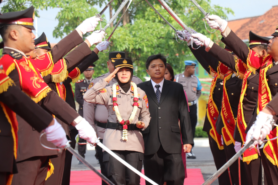 Didampingi suami, Kapolres Bantul melewati pedang bersilang yang dibuka secara perlahan oleh barisan perwira, untuk membukakan jalan memasuki halaman Polres Bantul.