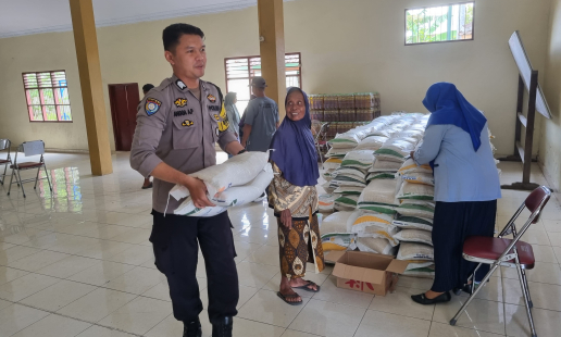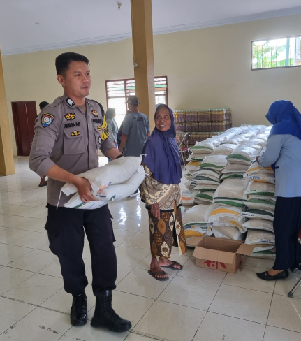 Bhabinkamtibmas Kalurahan Selopamioro, Aiptu Mardikun, melakukan pemantauan pembagian beras ...