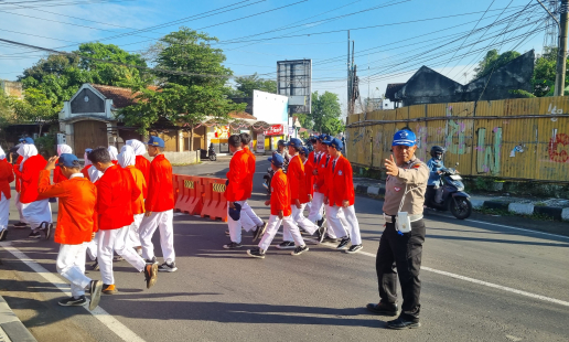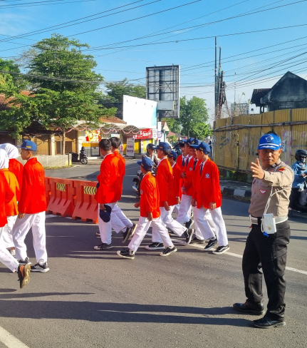 Personel Polsek Imogiri melaksanakan kegiatan pos pagi dengan pengaturan lalu lintas di ...
