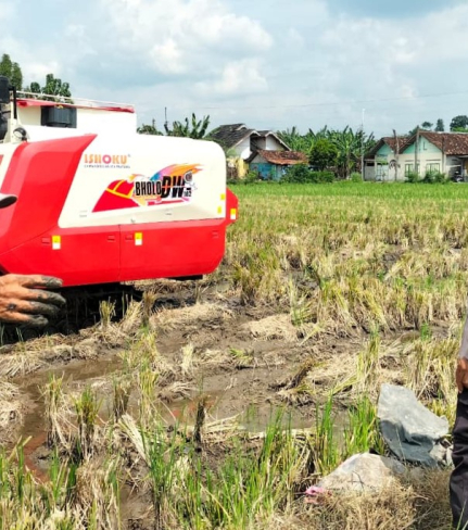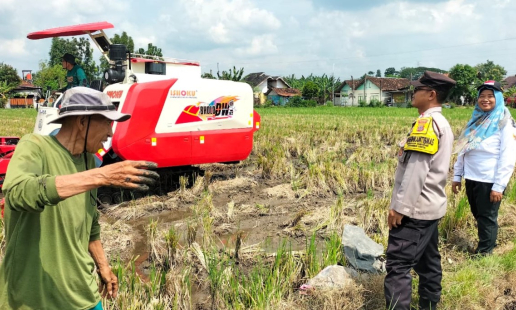 Bhabinkamtibmas Kalurahan Sabdodadi, Aiptu Moh Riyadi, menghadiri kegiatan panen raya padi yang ...