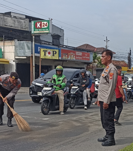 Anggota Polsek Sedayu bergerak cepat membersihkan tumpahan oli di Jalan Wates KM10, tepatnya di ...