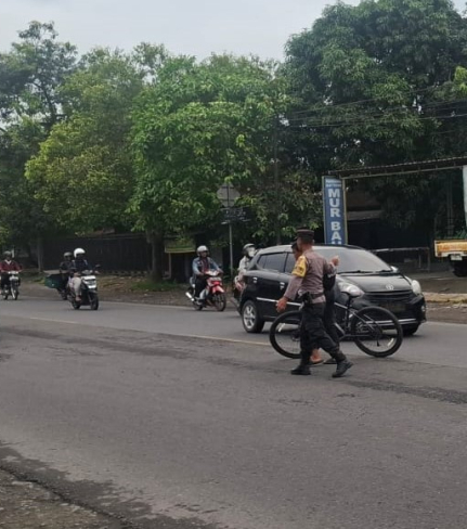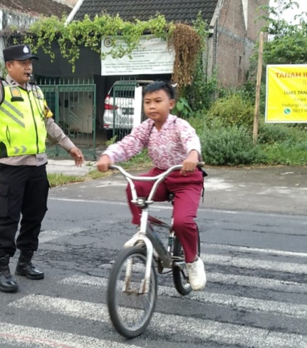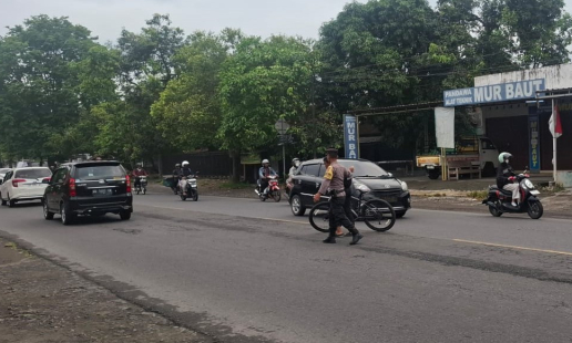 Bhabinkamtibmas Kalurahan Panggungharjo, Aipda Mulyadi, melaksanakan kegiatan pengaturan arus ...