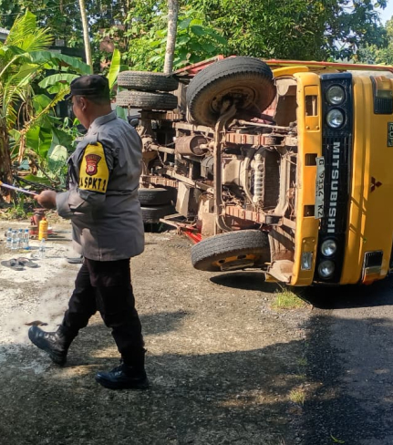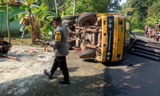 Kecelakaan tunggal menimpa sebuah truk bermuatan tiang WiFi di Jalan Guwo Selarong, Pajangan, ...