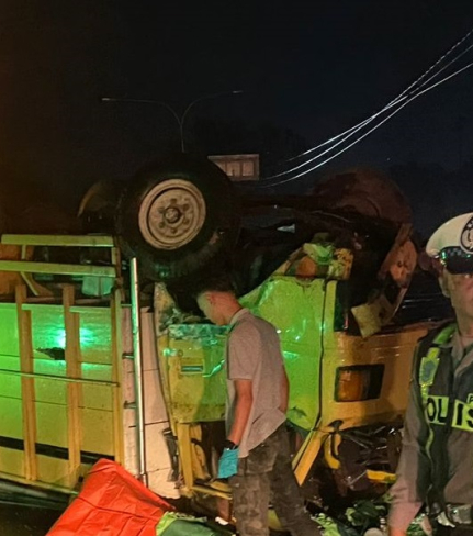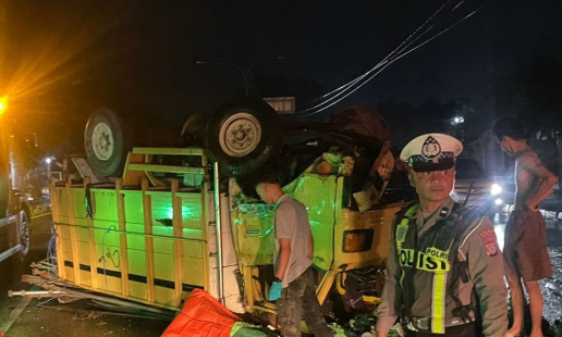 Kecelakaan lalu lintas tunggal menimpa sebuah kendaraan bak terbuka jenis Truk Mitsubishi Light ...