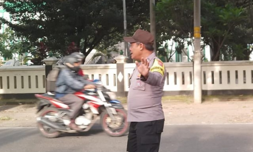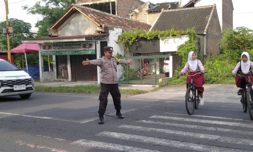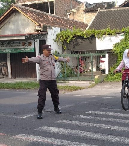 Bhabinkamtibmas Kalurahan Bangunharjo, Aiptu Suhanto SH, melaksanakan kegiatan pengaturan lalu ...
