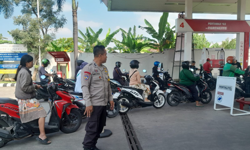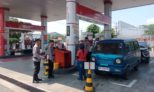Guna memastikan ketersediaan bahan bakar minyak (BBM), Bhabinkamtibmas Kalurahan Panggungharjo, ...