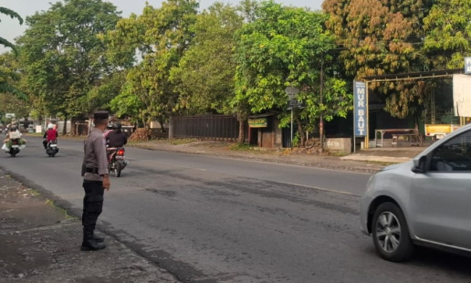 Bhabinkamtibmas Kalurahan Pendowoharjo Aiptu Wawan Giyarto melaksanakan pengaturan lalu lintas ...