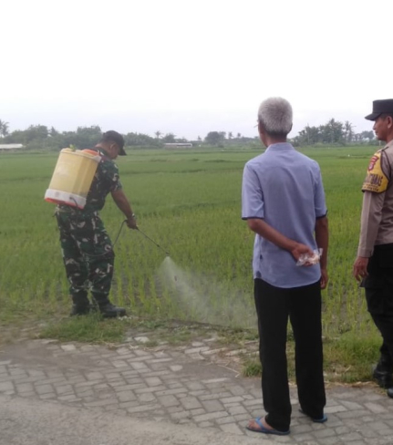 Bhabinkamtibmas Kalurahan Tirtohargo, Aipda Tohari, turut serta dalam kegiatan penyemprotan ...