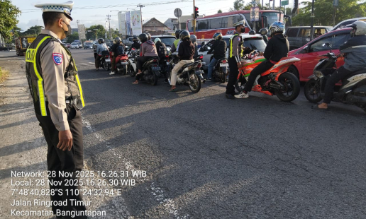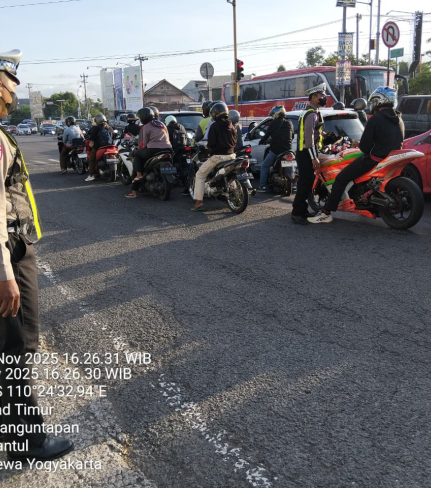 Anggota Unit Lalu Lintas Polsek Banguntapan melaksanakan kegiatan pelayanan Pos Sore kepada ...