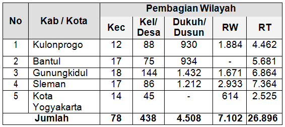 - (d) Wilayah administratif D.I. Yogyakarta terdiri dari 1 Kota dan 4 Kabupaten, 78 Kecamatan dan 438 Kelurahan/desa dengan perincian :