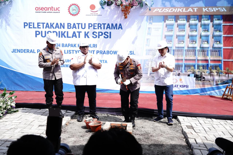 Kapolri Jenderal Polisi Drs. Listyo Sigit Prabowo, M.Si melaksanakan kegiatan peletakan batu pertama pembangunan gedung Pusdiklat Konfederasi Serikat Pekerja Seluruh Asean Trade Union Council (KSPSI ATUC) di Jln. Raya Waduk Jatiluhur Kp. Sukahurip RT 008 RW 005 Desa Jatiluhur Kec. Jatiluhur Kab. Purwakarta. Rabu (7/08/2024).Pada kegiatan tesebut bertindak selaku penanggung jawab adalah Bpk Andi Gani Nena Wea, SH.,M.H (Presiden DPP KSPSI , ATUC).