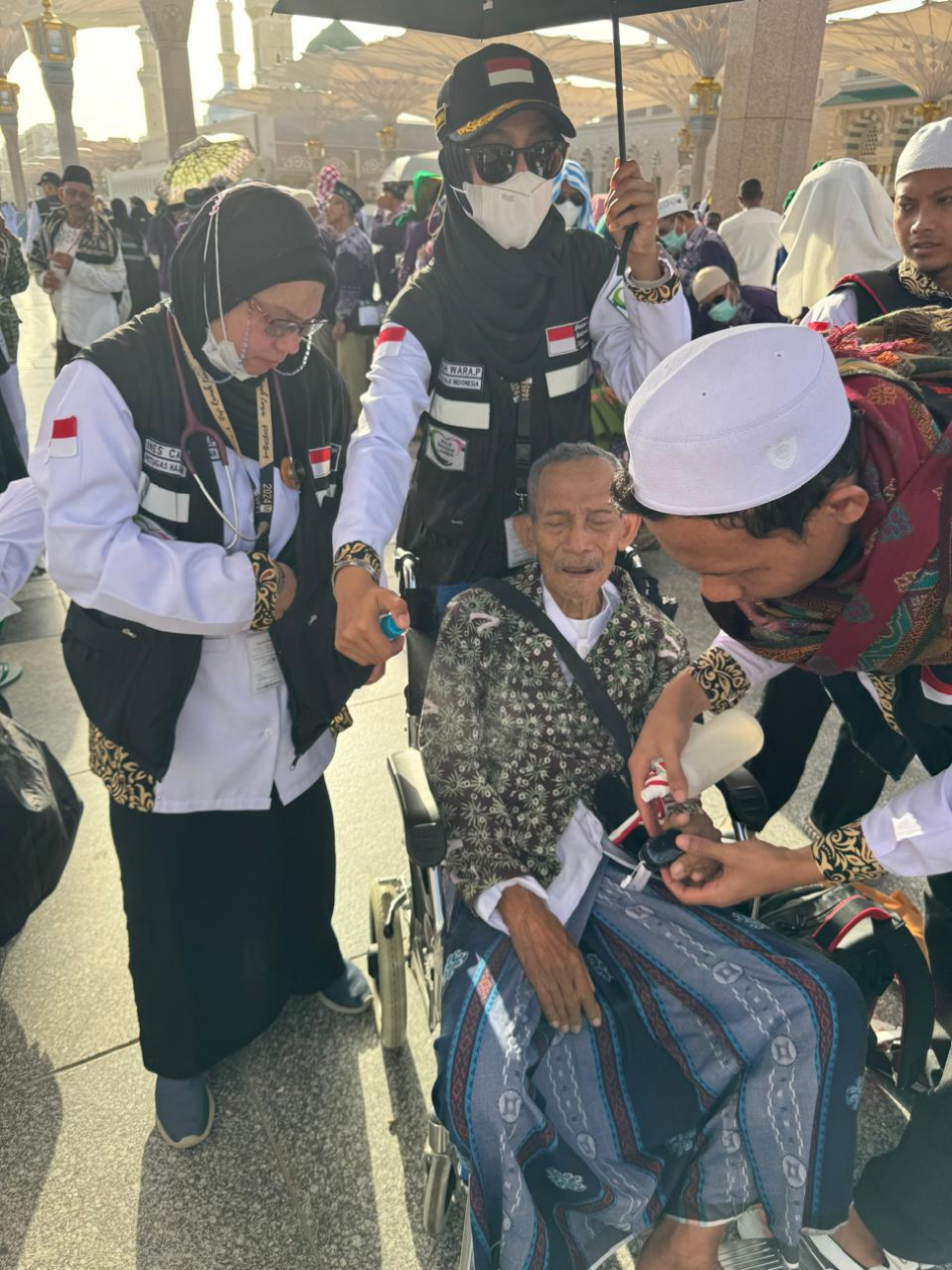 Akhirnya kita minta istirahat dulu sambil kita pijat-pijat dulu. Sudah segar terus tim kesehatan Saudi datang dan bilang keadaan bapaknya sudah segar dan bisa masuk Raudah, katanya.