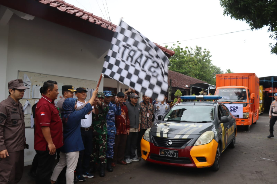 Wonosari - Polres Gunungkidul unungkidul bersama Kodim 0730/GK, KPU dan Bawaslu secara simbolis melepas keberangkatan logistik Pemilu dan melakukan pengawalan terhadap dokumen negara tersebut dari gudang KPU ke gudang PPS di masing-masing kapanewon di kabupaten Gunungkidul.Kapolres Gunungkidul AKBP Edy Bagus Sumantri,S.I.K, Dandim 0730/GK Letkol.Kav Anton Wahyudo, Bupati Gunungkidul H.Sunaryanto secara simbolis melepas keberangkatan pendistribusian logistik pemilu dari gudang KPU yang ada di budegan menuju ke PPS Plembutan, Paliyan, Gunungkidul, Sabtu, 10/2/2024.