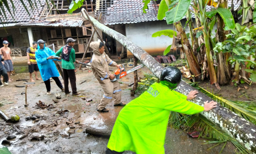 Sebuah pohon kelapa tumbang dan menimpa rumah warga akibat hujan deras disertai angin kencang ...