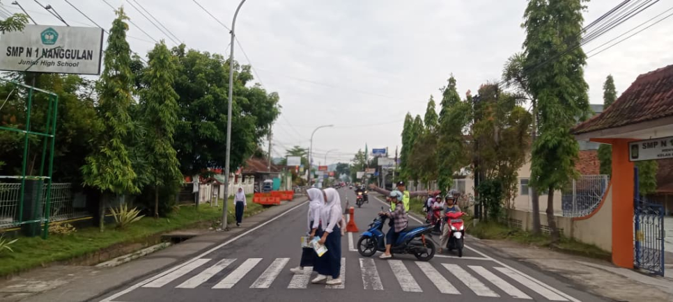 Anggota Polsek Nanggulan Rutin Laksanakan Yanmas Penyeberangan Jalan Bagi Siswa Sekolah