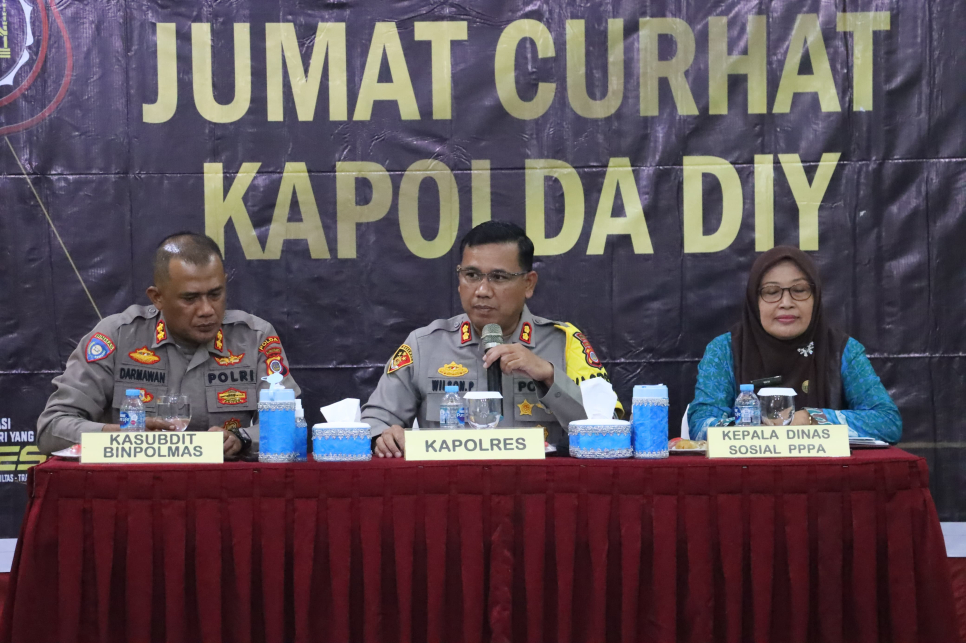 AKBP Sudarmawan, S.Pd, M.Pd., yang mewakili Kapolda DIY, menyampaikan bahwa Jumat Curhat adalah kesempatan bagi masyarakat untuk menyampaikan keluhan dan masukan secara langsung kepada Polri. "Kami terbuka terhadap segala kritik, saran, dan masukan yang konstruktif. Jangan takut untuk berbicara dengan kami. Jika ada masalah yang memerlukan penanganan lebih lanjut, kami akan segera menindaklanjutinya," kata Sudarmawan.