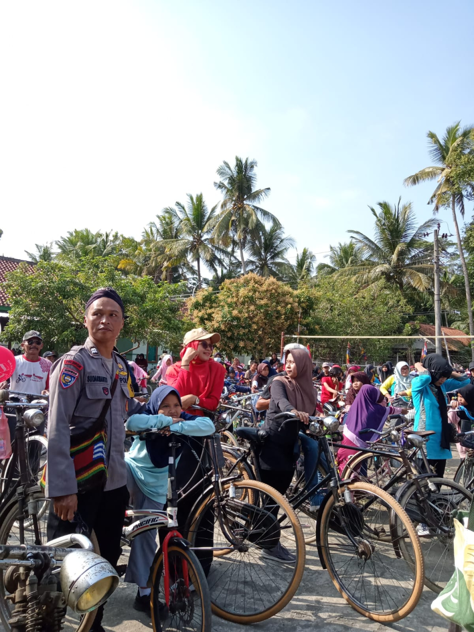 TEMON. Anggota Bhabinkamtibmas Kalurahan Janten Polsek Temon Polres Kulonprogo Aiptu Sudarmanto, S.H., melaksanakan pengamanan sekaligus mengikuti kegiatan sepeda gembira dalam rangka memperingati HUT RI ke-78 tahun 2023 di halaman Balai Kalurahan Janten, Temon, Kulonprogo, Minggu (27/08/2023).Dalam kegiatan ini Bhabinkamtibmas memberikan himbauan kepada masyarakat agar selalu berhati hati ketika berkendara di jalan agar berhati hati karena menggunakan jalan umum,supaya tidak terjadi kecelakaan.
