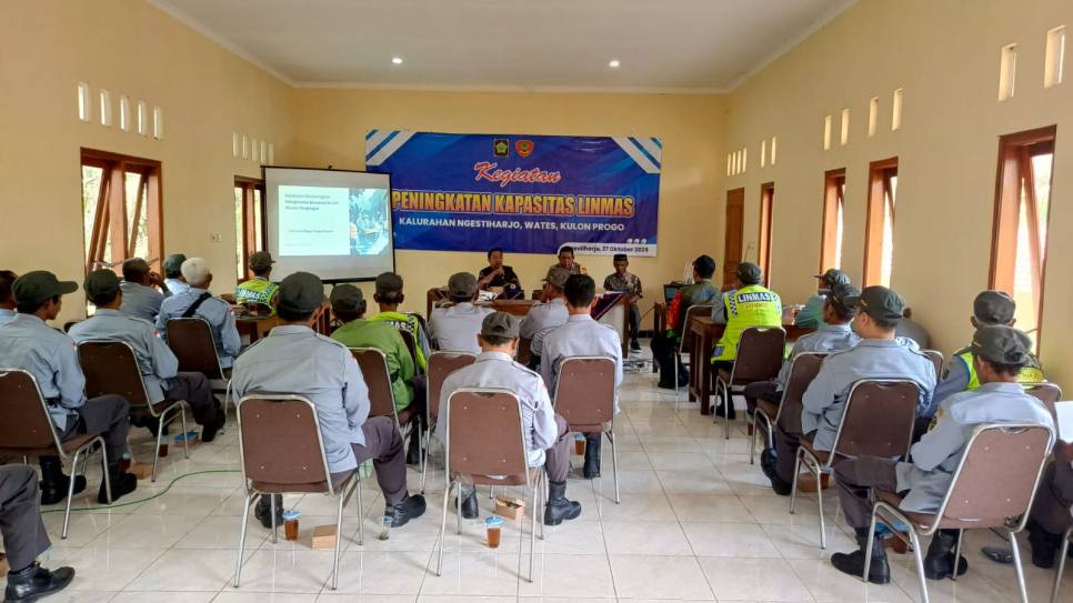 Wates - Dalam rangka meningkatkan kemampuan dan kesiapsiagaan anggota Linmas menghadapi berbagai situasi di wilayahnya, Bhabinkamtibmas Kalurahan Ngestiharjo Aipda Arif Fahrudin bersama Babinsa menghadiri kegiatan Peningkatan Kapasitas Linmas yang diselenggarakan di Balai Kalurahan Ngestiharjo, Senin (27/10/2025).Kegiatan ini juga dirangkai dengan pembentukan Keluarga Sadar Hukum (Kadarkum) serta Pos Bantuan Hukum (Posbankum) tingkat Kalurahan Ngestiharjo, dengan tujuan menumbuhkan kesadaran hukum dan meningkatkan partisipasi masyarakat dalam menjaga ketertiban serta keamanan lingkungan.