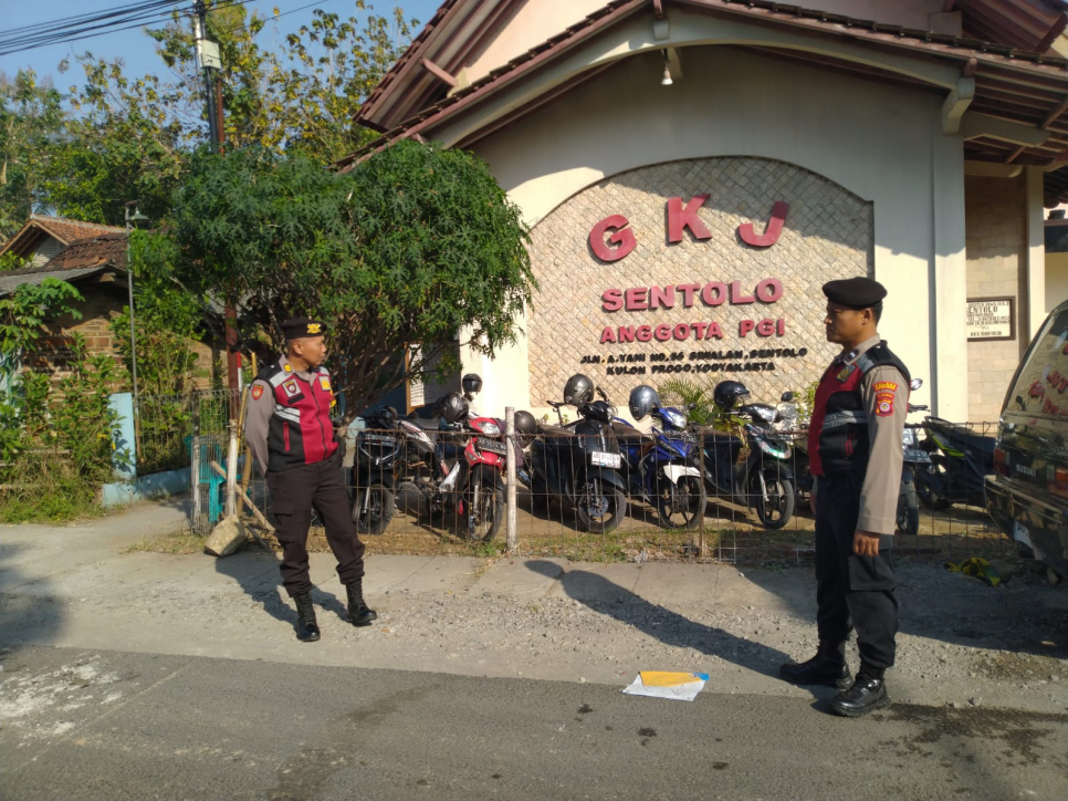 SENTOLO.Kanit Samapta Polsek Sentolo AKP Sayana bersama Panit IK Polsek Sentolo Aiptu Sapto Hardoyo, SIKom dan PS.Panit III Samapta Aipda Purnomo serta Banit Samapta Aipda Ari Wibowo, melaksanakan progam PASTI (Pengamanan Setiap Tempat Ibadah). Pelaksanaan PASTI dalam kesempatan tersebut pada kegiatan Ibadah Kebaktian Minggu Genap di GKJ Sentolo, Padukuhan Siwalan, Kalurahan Sentolo, Kapanewon Sentolo, Kulonprogo. Kegiatan pengamanan (PAM) tersebut dibantu oleh seorang anggota Linmas dan 3 orang petugas PAM Swakarsa GKJ Sentolo. (Minggu/29/07/2023)Kegiatan PAM Gereja ini dilaksanakan oleh personel Polsek Sentolo sebagai bentuk upaya untuk memberikan rasa aman dan nyaman bagi para jemaat di GKJ Sentolo dalam melaksanakan ibadah, mengingat beberapa waktu lalu di wilayah lain di Indonesia kembali terjadi teror bom di Gereja. Ibadah Kebaktian Minggu Genap di GKJ Sentolo pada kesempatan tersebut dipimpin oleh Pendeta Pdt.Vikky Tri Sumekto, STh dengan tema Tak Lagi Najis dan dihadiri oleh sekitar 60 orang Jemaat. Para Jemaat yang hadir masih banyak yang tertib dengan tetap memakai masker dan menerapkan prokes meskipun pandemi sudah berlalu.