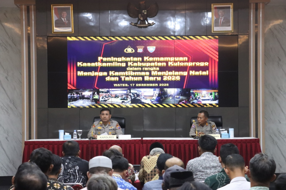 Kulonprogo - Polres Kulonprogo melalui Satuan Pembinaan Masyarakat (Satbinmas) menggelar kegiatan Pembinaan dan Peningkatan Kemampuan Kepala Satuan Keamanan Lingkungan (Kasatkamling) bertempat di Aula Bhara Daksa Polres Kulonprogo, Rabu (17/12/2025).Kegiatan tersebut dihadiri langsung oleh Kapolres Kulonprogo AKBP Dr. Wilson Bugner F. Pasaribu, S.I.K., M.H., Wakapolres Kulonprogo Kompol Amalia Normadiah, S.H., S.I.K., Kasat Binmas AKP Sayana, para Kanit Binmas jajaran Polres Kulonprogo, serta Kasatkamling jajaran Polres Kulonprogo.